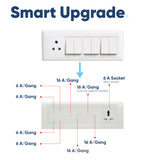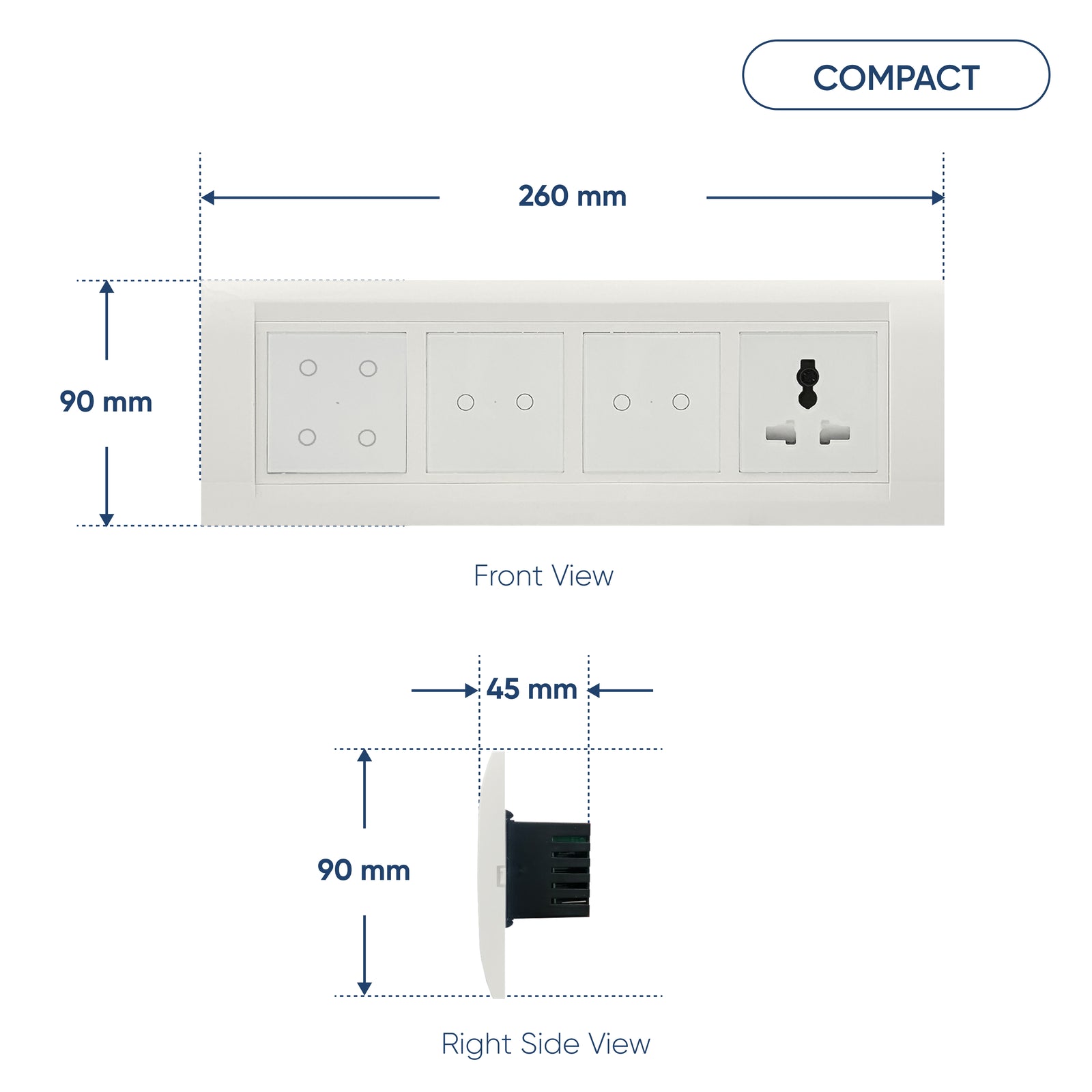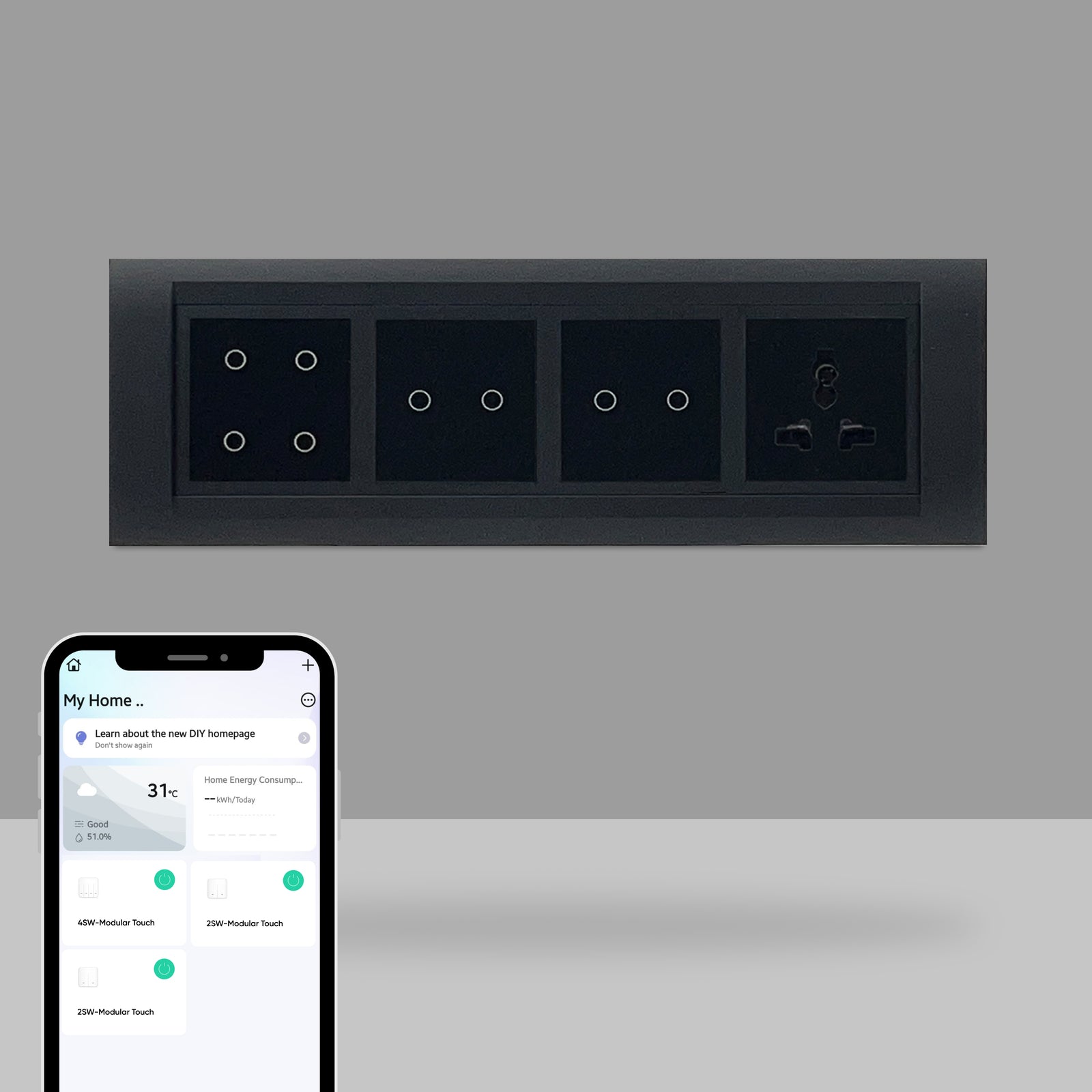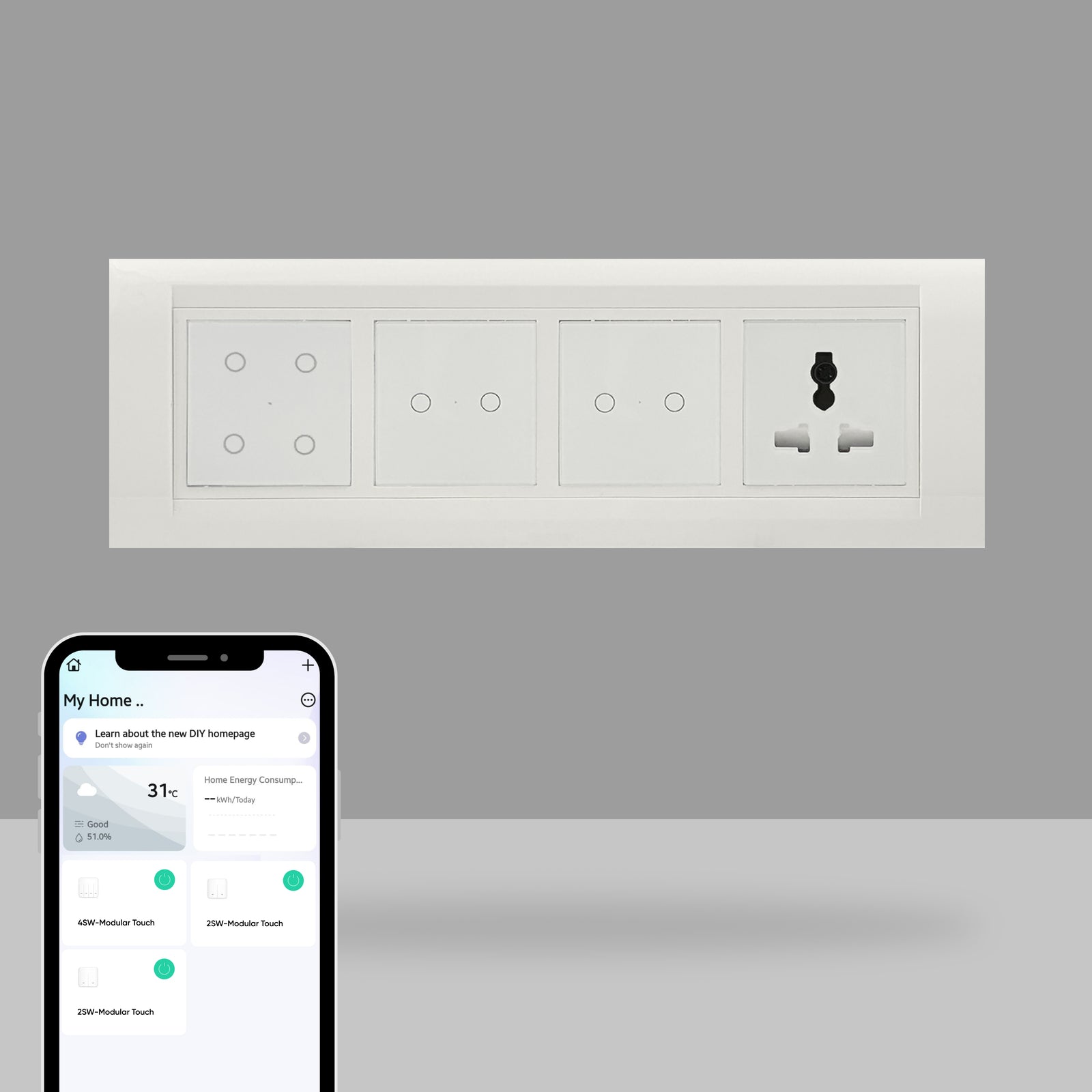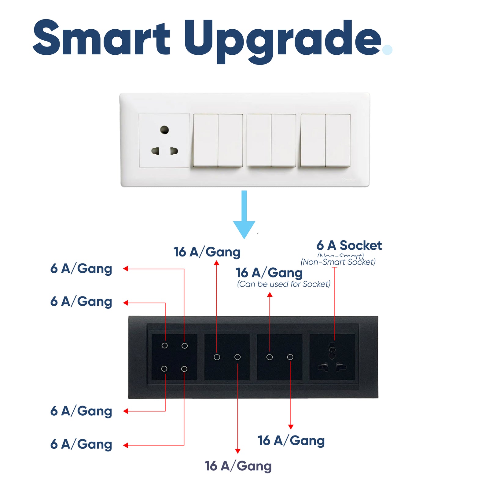 - Maximize Your 8-Module Space: Replace a traditional setup of 6 non-smart switches and 1 socket with a smart combo offering 4 smart modular touch switches (6A each), two nos of 2-touch modular smart switches (16A each) and 1 regular socket (6A) (total capacity 8 switches and 1 socket).