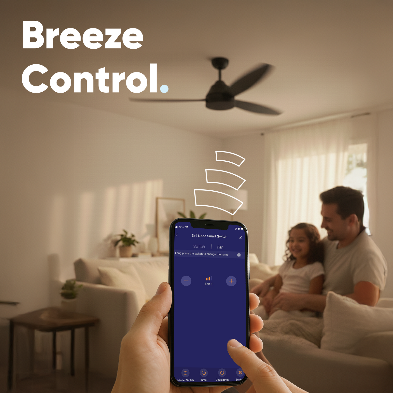 Introducing the 3+1 Fan Retrofit Switch, an innovative and convenient way to upgrade your home's lighting system. You can control 3 switches and 1 Fan. Product also comes with manual regulator to control fan with manual regulator as well.This retrofit switch is designed to be easily retrofitted into your existing switch boards, allowing you to control your lights with your smart phone via wifi/bluetooth. Made in India with a robust design. The retrofit switch also allows scheduling, and even works without internet. Plus, enjoy great after sales support and 1 year warranty for peace of mind. Upgrade your home with the 3+1 Fan Retrofit Switch today!