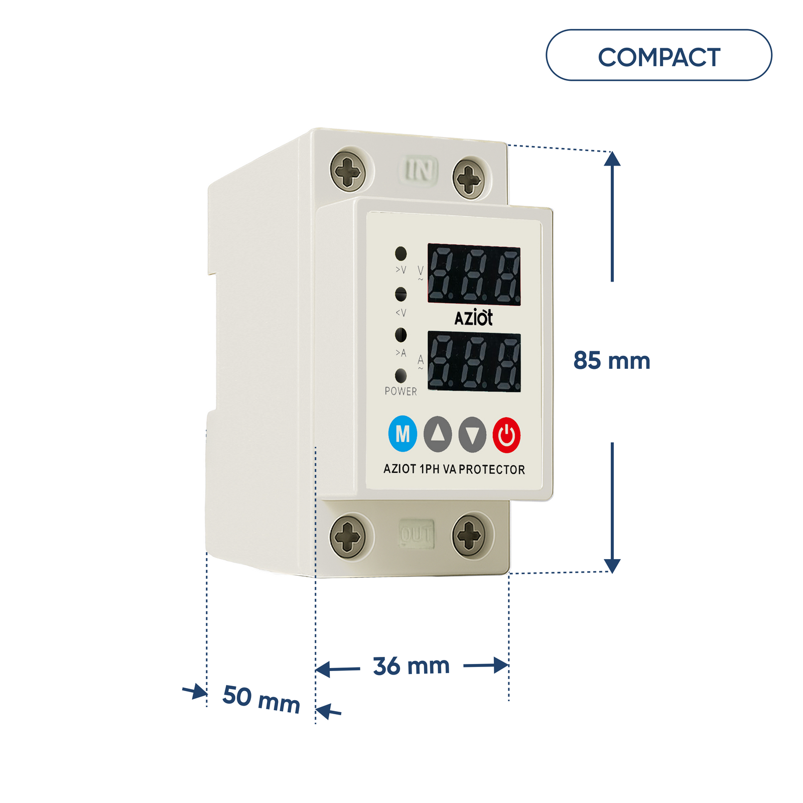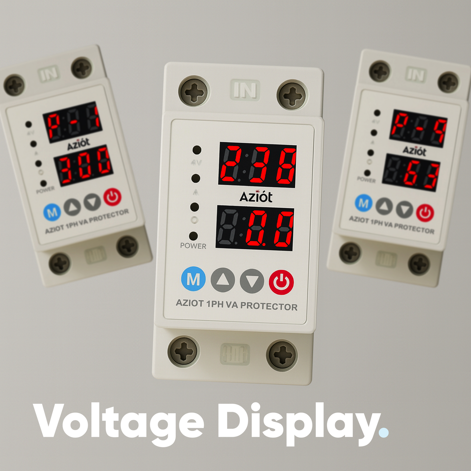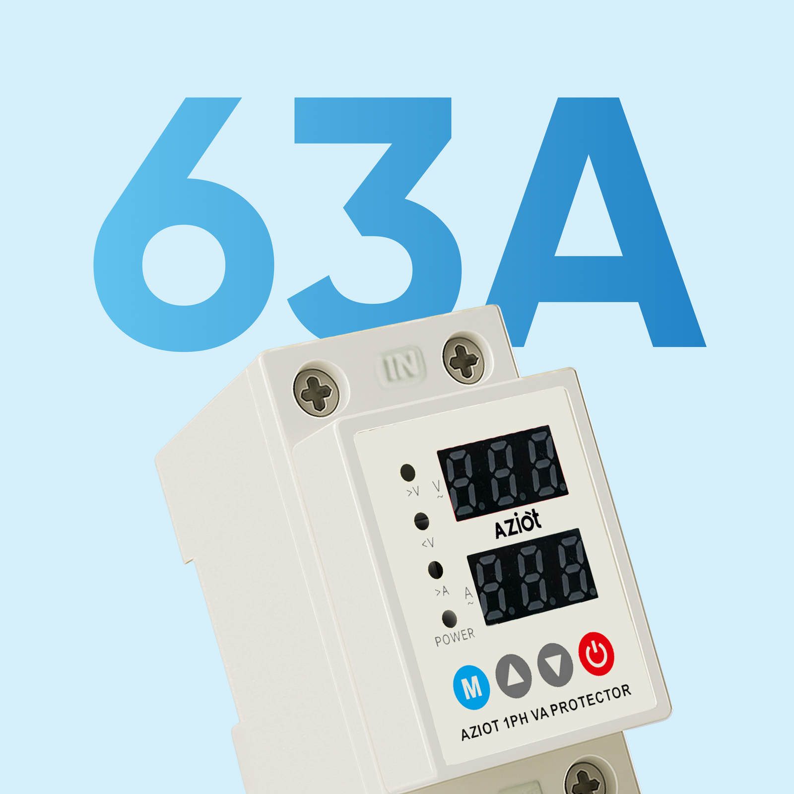 AZIOT Automatic Over/Under Voltage & Overload Protector with Adjustable Settings, Auto Reconnect, LED Display – Single Phase 230V, 63A (13.8kW) DIN Rail Mounted